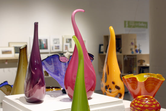 Working out of a glass studio in Columbus, Jim hand blows his pieces from liquid glass taken from a 2000-degree furnace. Each piece is created by adding color and shaped by blowing through a steel pipe to gently move the piece toward the desired shape. Jim states the process is the most intriguing part: the challenge is to combine brilliant colors and shapes to draw the viewer’s attention to the finished piece that will add a splash of excitement to the space it occupies.