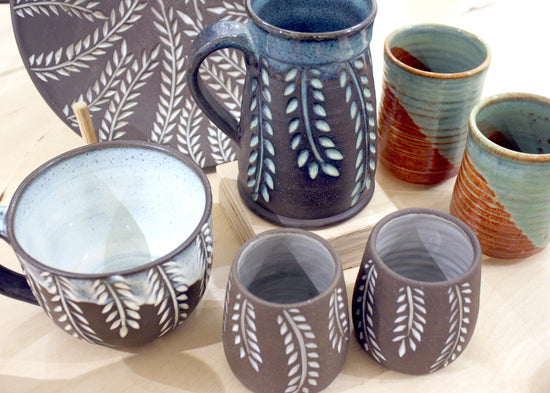 Husband and wife team, David and Lisa Dault still carve out time to be creative amidst running a business, homeschooling, and raising their five girls. David admits to building his first potter’s wheel using the motor from his treadmill, and doesn’t hesitate to give his wife most of the credit for the intricate and detailed pieces they produce by hand. They are passionate about their work, and hope everyone connects with a piece of unique and beautiful pottery “to make their drinks and meals a little more special.”