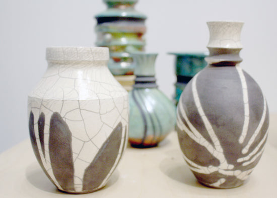 Stephanie received her BFA in Sculpture from Bowling Green State University, and currently coordinates the ceramics program for Edison State Community College, while teaching at various other community clay studios in the Dayton area. Currently creating Raku-fired vessels using a modernized version of the traditional Japanese firing technique of smoking clay in barrels for multiple surface effects, her forms display traditional brush stroke and splattered glazing methods.