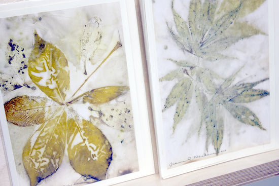 Thinking sustainably, Jeanne uses natural objects like plants and fibers to create unique eco-print greeting cards and artwork. Eco-print is a natural dye process made with sycamore, oak, gingko, and geranium leaves, with pussy willow and birch twigs sewn to the paper. Phrases are then scrawled through the composition as if they are wisdom discovered in the wilderness. Gold circles evoke the sacred longing to be one with nature.