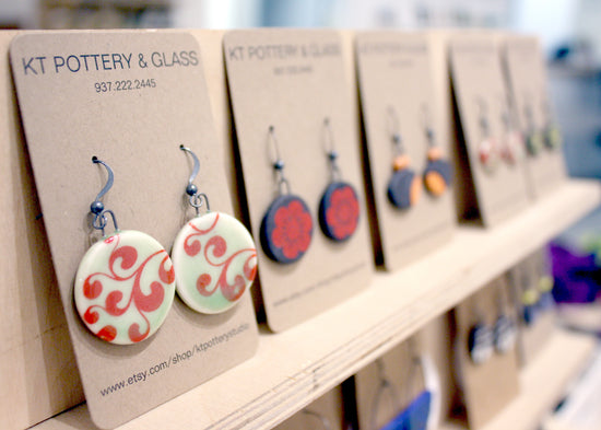 Kevin is a glass and ceramic artist living and working in Dayton, Ohio. His choice of medium is fused glass that he manipulates to create functional platters, kitchenware, and jewelry items. He also uses stoneware and porcelain to create durable earrings in abstract shapes and patterns.