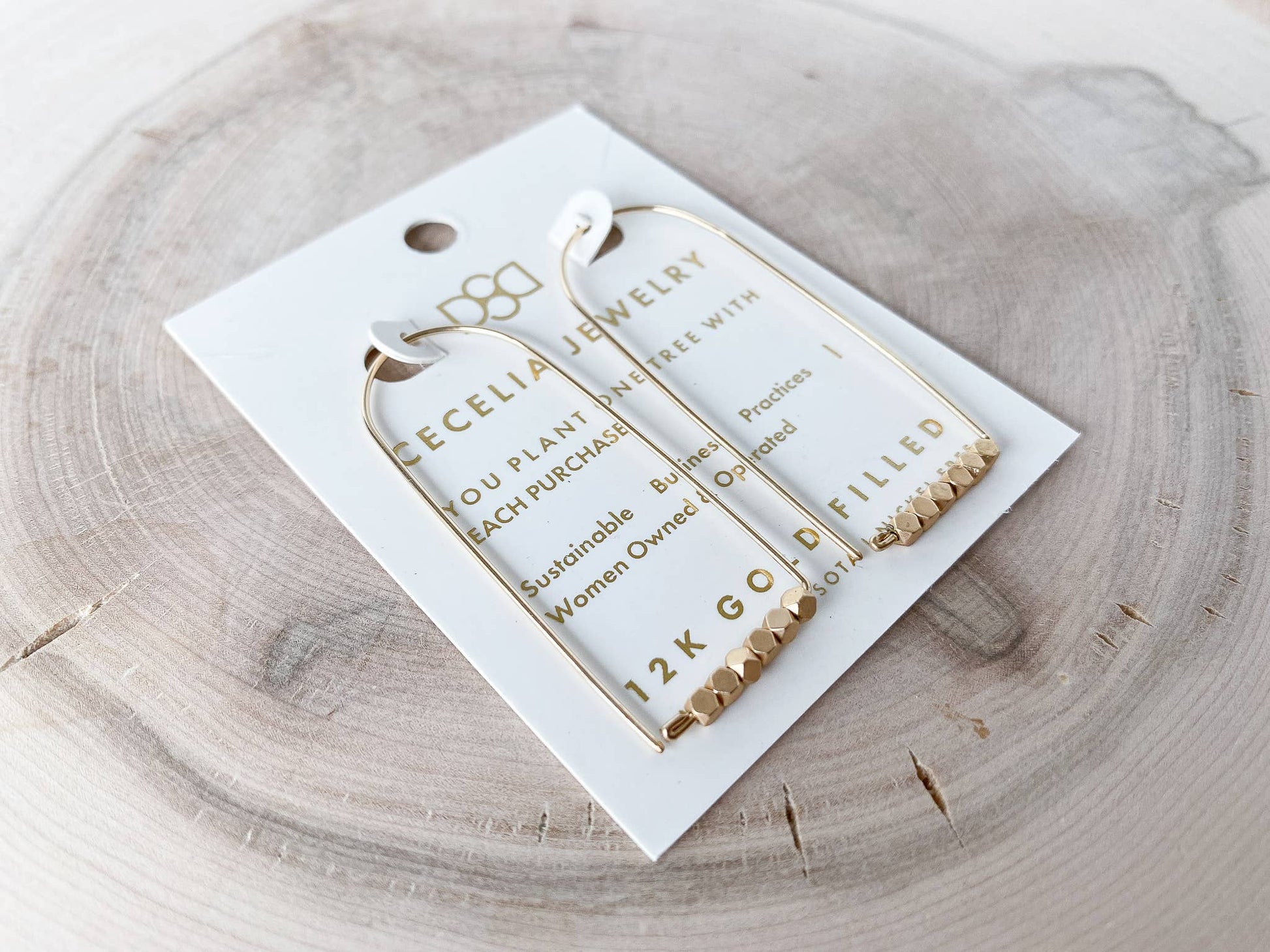 Our Gold Geometric Earring Collection is handmade in Minnesota. You plant one tree with each purchase. These timeless earrings are handmade with 12k gold filled wire and gold plated beads. These earrings come carded on our recycled Kraft earring cards. We recommend displaying these on our swivel earring display.