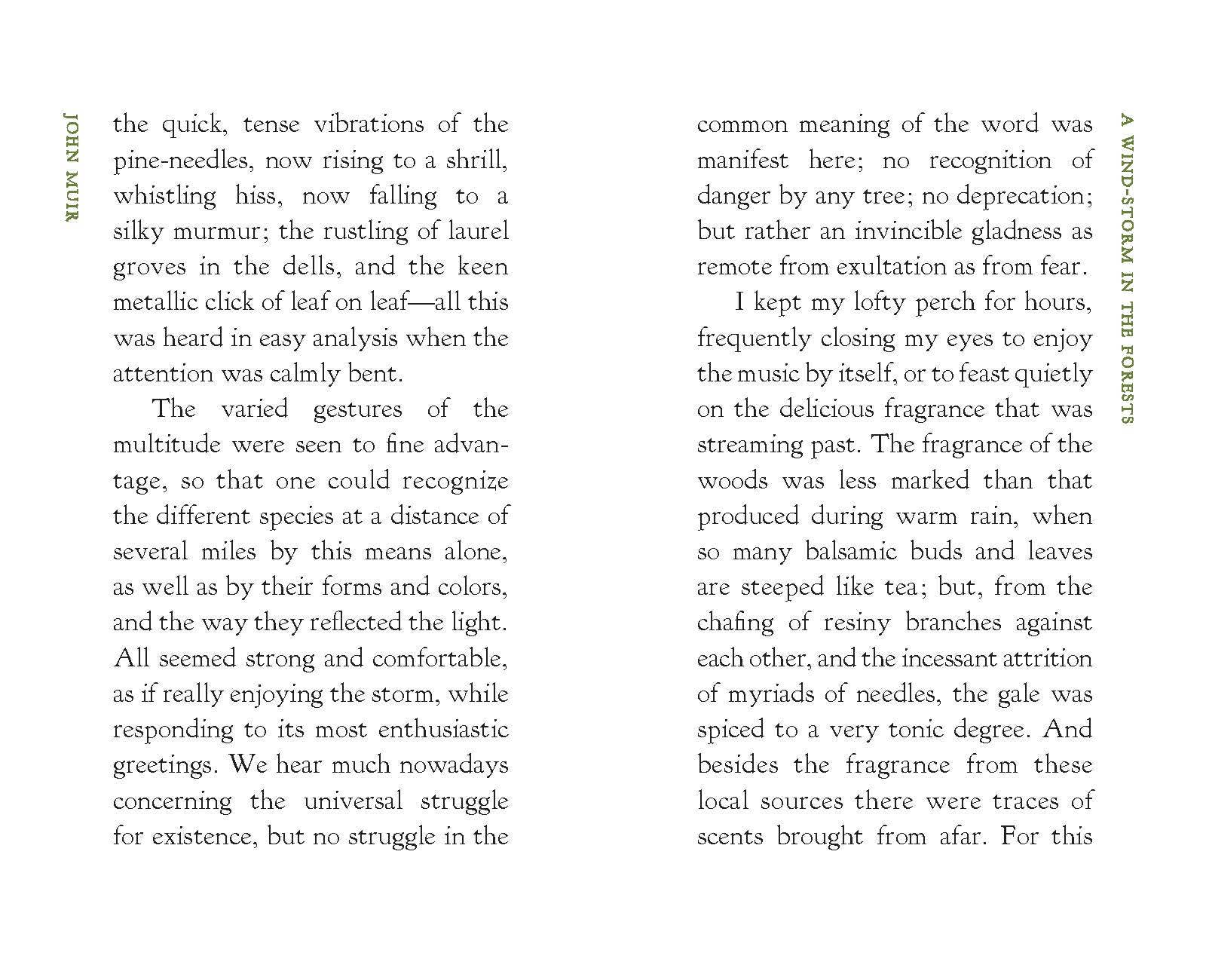In this essay from 1894, Muir describes the grandeur of the winds at play in the forests, with stunning and musical detail about the trees of the Sierra and their individual reaction to the wind. Muir's story of climbing a 100-foot Douglas Spruce to experience the sway and swirl of a storm for himself is unforgettable.