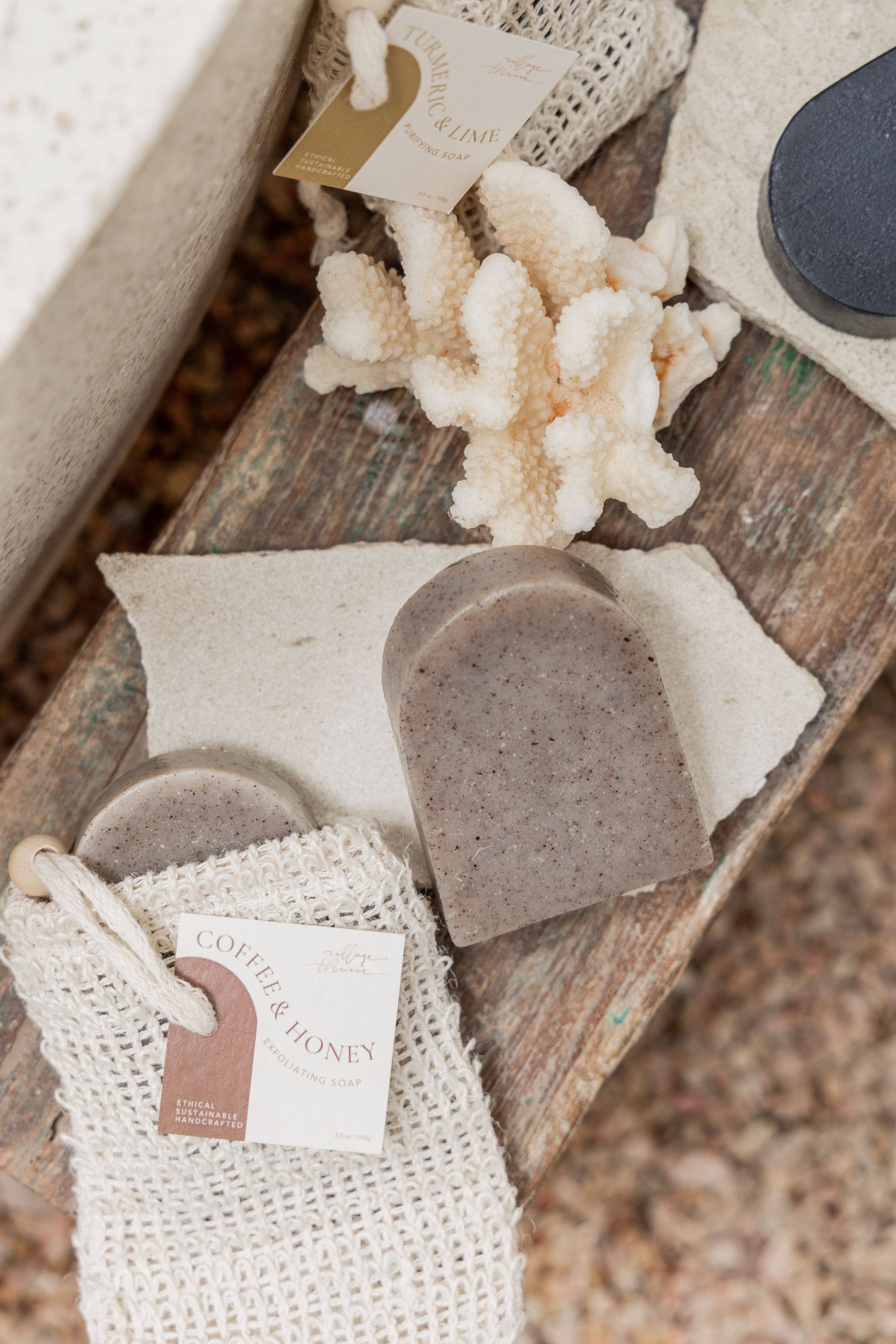 In partnership with an Indonesian non-profit this soap is created from local Balinese ingredients. Handcrafted by women who are not only given a living wage for their work but receive an education on proper hygiene which in turn brings better health to their communities. This signature arch shaped bar is 3.5oz and has a coconut oil base leaving your skin feeling soft and moisturized. Each bar has been designed with a precise pH Balance and holds its own unique skin health benefits. Comes with a natural exfoliating sisal drawstring bag. Ingredients: Coconut Oil, Coffee, Honey