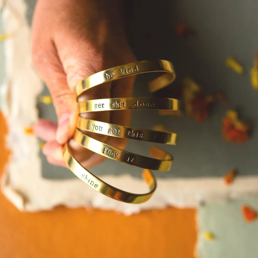 Brass cuff bracelet is hand stamped with the word "Shine." Cuffs are 3/8" wide on the surface. Handcrafted at the Bella Vita Studio in Downtown Little Rock, Arkansas.