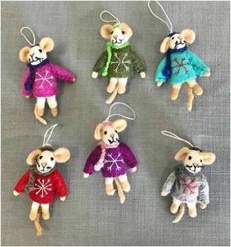 Our colorful mouse in ski sweater ornaments come set of 6. They are Hand Made with Care in Kathmandu Nepal. We work with a small family owned work shop, that follows Fair Trade practices and strives to improve the standard of living for their artisans.