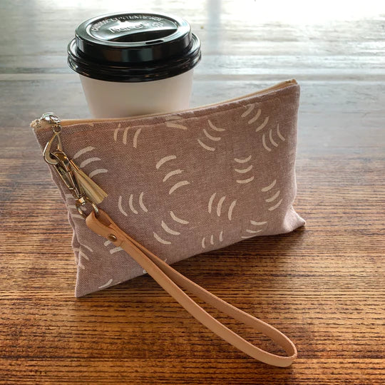 Measures 7.5" x 5", featuring a suede tassel, cotton printed lining and a zipper closure. Detachable leather wristlet strap. Available linen prints. Spot Clean.