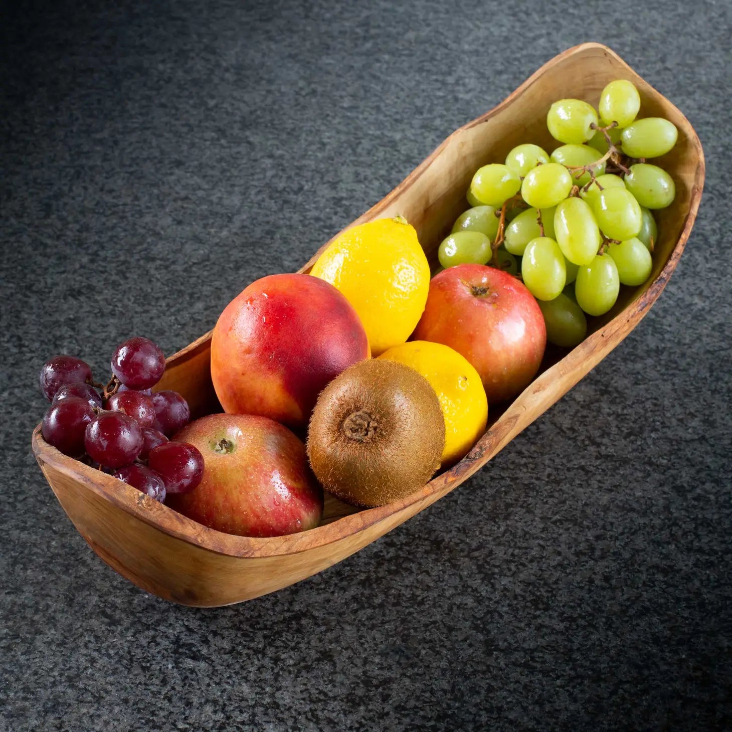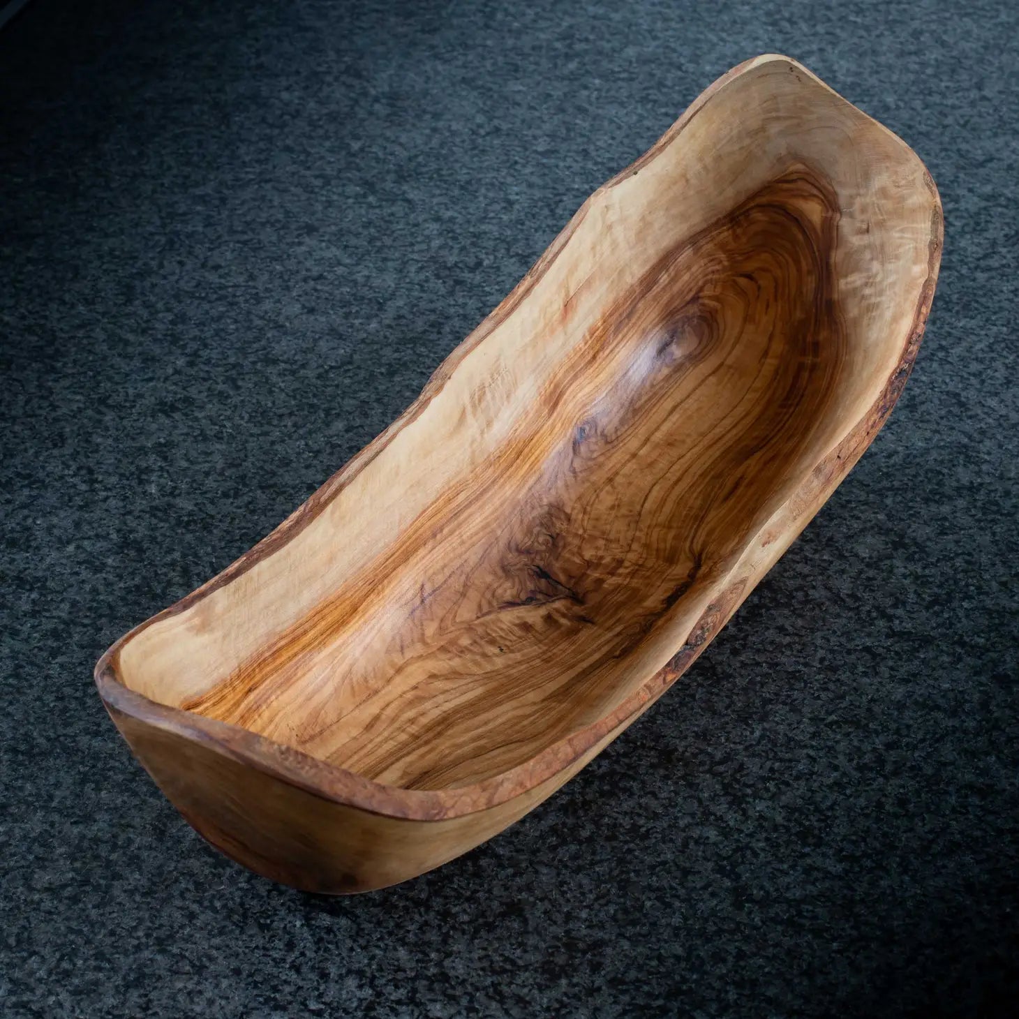 A versatile rustic oval-shaped long bowl for fruits, salads, snacks, and so much more. Olive wood is a rare and precious wood from the Mediterranean. The bowls are solid, robust, and sturdy. Thanks to their rigid and firm surface, they are ideal for use in the kitchen or as a flatware decor item.