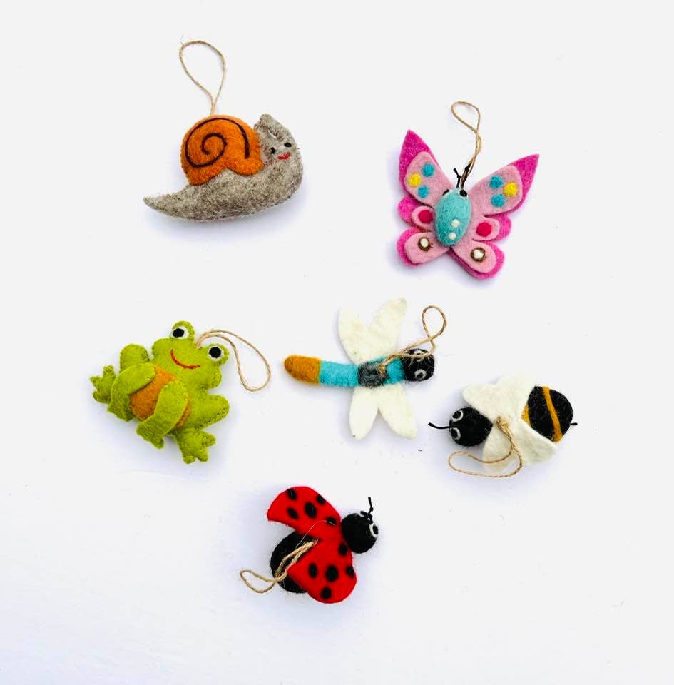 Assorted ornaments featuring Frog, Butterfly, Snail, Ladybug, Bee and Dragonfly. Ornaments are hand made in Nepal in a family-owned workshop that follows fair trade practices. They employ more than 200 women who were at risk for human trafficking who now make a fair wage and work in a safe environment. A portion of profits goes to pay school tuition for 5 workers' kids each year and reimburse employees for medical expenses.