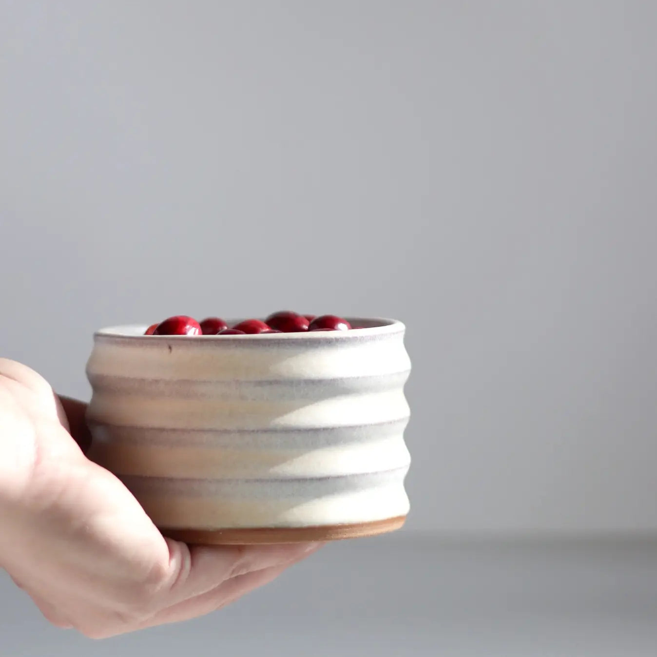 A modern, textured bowl perfect for single servings of ice cream, rice, soup, oatmeal, more ice cream, smoothies. The zigzag pattern fits your fingers perfectly for a comfy grip that's terrific for fidgeting. We also love these as pen cups or as a succulent planter. They'll add a touch of functional elegance to any home. Holds approximately 14 oz to the rim microwave and dishwasher safe